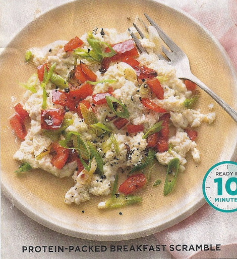 2.) In a small non-stick skillet, heat oil over medium-high, add bell pepper and scallion whites. Cook until scallion has browned, 3 to 5 minutes; transfer to a plate. Add egg mixture to skillet; cook, stirring occasionally with a rubber spatula, just until set, 2 to 3 minutes. Top with bell-pepper mixture and scallion greens.