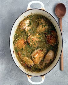 In a food processor, puree tomatillos; set aside. In a large Dutch oven or heavy pot, heat oil over medium-high. Season chicken with salt and pepper and add to pot, skin side down. Cook until browned on one side, 6 minutes. Transfer to a plate.