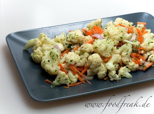 Heat oven to 450 degrees. Toss cauliflower, carrots, salt and one tablespoon of olive oil. Roast vegetables for 18-20 minutes. Whisk together vinegar, sugar, oregano, thyme, pepper, and remaining 1 tablespoon olive oil and toss on roasted vegetables. Cool to room temperature. Serve with turkey burgers.