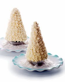 A tree-shaped cake laden with snowy frosting. To make the trees, bake the batter inside waffle cones, lining the cones with parchment paper and standing them in holes cut into a disposable foil roasting pan. When the cakes are ready, remove and discard the cones and parchment. Then invert each tree cake onto a mini cupcake, and cover it with cream cheese frosting using a pastry bag and a star tip. Sprinkle with sanding sugar, and use a little extra to create beds of "snow" for serving