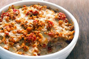 LAYER chicken, basil and cheese in 3-qt. casserole or 13x9-inch baking dish.