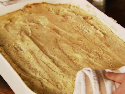 Spread the potatoes into a large buttered baking dish. Dot the top with butter. Bake until heated through, about 30 minutes.