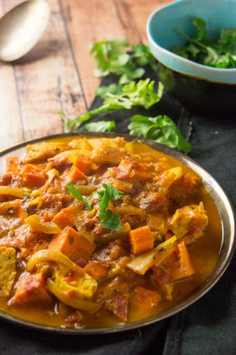 Cook for 10 more minutes, or until sweet potatoes are cooked through (time will vary depending on size of sweet potato cubes). Once they are tender, serve curry hot, sprinkled with cilantro.