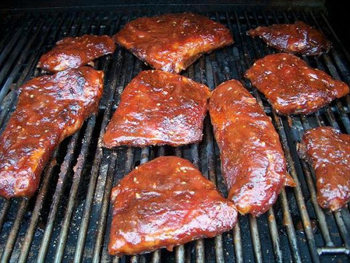 1 At least the night before you make the ribs, if not earlier, combine the BBQ sauce ingredients in a saucepan. 2 Simmer over medium low heat for 1/2 an hour. 3 Chill overnight (keeps several months in the refrigerator). 4 The night before you make the ribs, combine the spice rub ingredients in a bowl, and mix together well. 5 Pat about 1/3 of the total spice rub on the top and bottom of the rib slabs. 6 Allow to sit, refrigerated, overnight. 7 The next day, about 5 hours before dinner, take the ribs out of the fridge, sprinkle top and bottom with about half of the remaining spice rub. 8 Let sit at room temperature for 45 minutes. 9 Take BBQ sauce out of refrigerator and allow to come to room temperature. 10 Heat oven to 200- 225 degrees Fahrenheit. 11 After the ribs sit at room temperature, put them in the oven on a large sheet tray, or indeed several large sheet trays if needed. 12 Bake 4 hours. 13 If the ribs start to look dry, baste them with a little beer. 14 About halfway through cooking time, sprinkle ribs with the rest of the spice rub. 15 about 45 minutes before ribs are done, brush with a fairly liberal amount of the BBQ sauce. 16 Once ribs are done, baste them with more sauce, if you like. 17 Let ribs sit 10 minutes before cutting into individual ribs, or 1/2 slabs, as I prefer. 18 Serve with plenty of extra sauce on the side, and plenty of napkins.