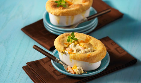 3. Preheat oven to 425ºF (220ºC). Pour filling into oven-proof bowls or ramekins. Sprinkle cheese over filling.