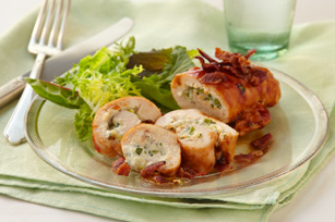 POUND chicken to 1/4-inch thickness; place, top-sides down, on work surface. Mix cream cheese, onions, parsley and garlic; spread down centres of chicken breasts. Roll up, starting at one short end of each. Place, seam-sides down, in single layer in shallow pan.