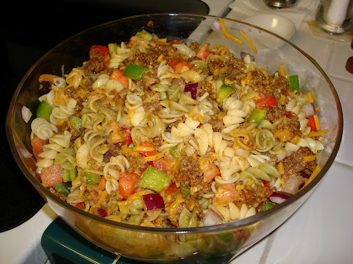 Cook pasta according to the package directions. Meanwhile, in a large skillet, cook ground beef over MEDIUM heat until no longer pink. Add taco seasoning and water to the ground beef; Simmer, uncovered, for 15 minutes. Drain pasta and place in a large bowl; Add seasoned ground beef, green peppers, onions, tomatoes, black olives and cheddar cheese. Mix well and serve hot with garlic bread.