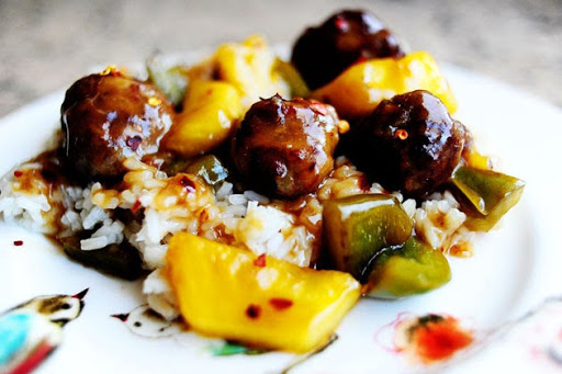 Pour off oil from pan and return pan to medium high heat. When pan is hot, throw in the chopped green peppers and cook for one minute. Add pineapple to pan and cook for one minute, stirring gently. Pour in stock/soy sauce mixture, then add meatballs. Stir gently to combine and allow to cook and bubble for a few minutes, or until sauce is thickened. Add salt and crushed red peppers to taste. (Hint: this dish is yummy if it’s a little spicy.)