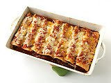 Microwave tortillas on high for 30 seconds. This softens them and makes them more pliable. Coat the bottom of 2 (13 by 9-inch) pans with a ladle of enchilada sauce. Using a large shallow bowl, dip each tortilla in enchilada sauce to lightly coat. Spoon 1/4 cup chicken mixture in each tortilla. Fold over filling, place 8 enchiladas in each pan with seam side down. Top with remaining enchilada sauce and cheese.