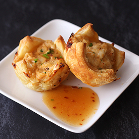 Cut the puff pastry into 9 squares. Press each square into 9 holes of a muffin tin. Divide the crab mixture between the pastry cups. You can refrigerate the puffs for 1 day at this point before baking.