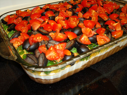 In a small pot, heat the refried beans. Remove the beans from the heat and allow to cool about 2-4 minutes. In a medium size bowl, mix the Hidden Valley Ranch Dip Mix with the sour cream. In an 8” x 8” glass dish, spread the heated refried beans evenly across the bottom of the dish. Spread the Ranch Dip on top of the layer of refried beans. (Optional step: Swirl the salsa into the dip mix.) Top the Ranch Dip Mix with shredded cheddar cheese and green onion. Finish the garnishing by adding the black olives and tomatoes. *Keep the dip refrigerated until serving.* Serve with Tortilla Chips or Tostitos Scoops.