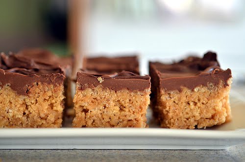 Melt the chocolate chips and butterscotch chips in a microwave safe bowl for about one minute, stirring every 30 seconds. Stir until melted and smooth. Spread evenly on top of the Rice Krispies. Let cool until hardened before slicing into bars.