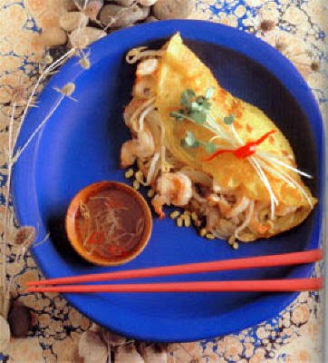 SUGGESTIONS: Don't feel bound to using all the filling ingredients listed above, for this dish originated when there was actually not much food in the house. You can compose a plain happy pancake with just the browned onions, then fill it with bean sprouts, making a vegetarian combination. Or, use only one protein, either pork or shrimp, if that's all you have.