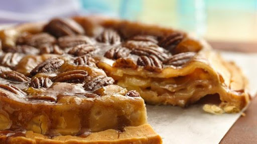 Hear oven to 452 degrees. In 9-inch glass pie plate, mix brown sugar, butter and corn syrup. Spread evenly in bottom of pie plate. Arrange pecans over mixture. Make pie crusts as directed on box for two crust pie, placing bottom crust over mixture in pan.
