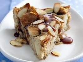 In large bowl, mix all ingredients except bread, almonds and caramel topping with wire whisk until smooth. Fold in bread. Pour into quiche dish; sprinkle with almonds.