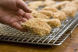 In a shallow bowl, combine the bread crumbs, cornflakes, Parmesan cheese, salt and pepper. Coat fish with butter-flavored spray, then roll in crumb mixture.