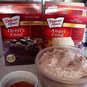 Then simply store the mixture in an airtight container until you get the urge for dessert. Then just put three Tbsp. of the dry mixture in a big coffee mug and stir in 2 Tbsp of water. Microwave it for one minute and you will have a single serving of cake! Top with fruit, ice cream, whipped cream or whatever! Awesome for those of us who want something sweet every now and then without making an entire cake!!!You need two boxes of cake mix. One can be any flavor you prefer, but the other MUST be Angel food cake mix.