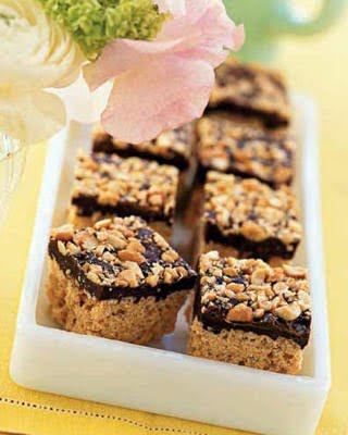 These little squares pack a mighty punch for minimal effort—and only 20 minutes of prep. Crisp rice cereal is flavored with peanut butter, topped with chocolate and peanuts, then finished off in the fridge.