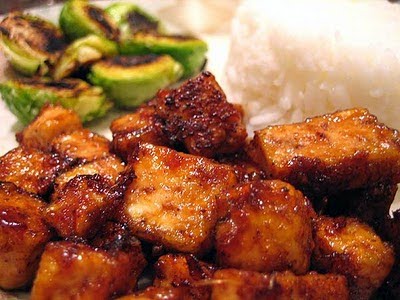 Dredge the cubed tofu in cornstarch. Heat the oil over high heat. When hot, slowly and carefully add the tofu. Saute it, gently tossing to ensure that as many sides of the tofu get crisp. This will take about 5 – 7 minutes. Add garlic and ginger. Toss gently to ensure that it is as evenly distributed as possible (if some of it clumps, that's ok). This will take about 30 seconds. Add toasted sesame oil, agave syrup, tamari, and chili powder. Toss gently and allow ingredients to get hot and coat all of the tofu. Serve over jasmine rice. I've also served this in lettuce leaves.