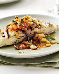 Light a grill or preheat a grill pan. Rub the fish with olive oil and season with salt and pepper. Grill over moderately high heat, turning once, until cooked through, about 9 minutes. Transfer the fish to plates, top with the caponata and serve.