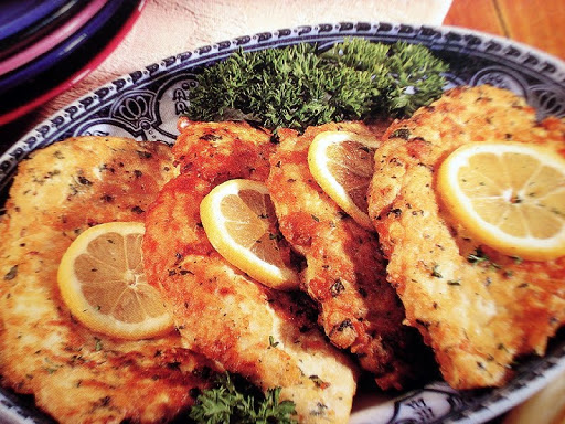 - 4 skinless, boneless chicken breasts pounded to 1/4-inch thickness