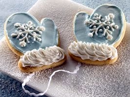 Using 1/2 cup of the creamy white frosting, frost cuffs of mittens. Stir food color into remaining white frosting. Frost remaining portion of mittens with blue frosting. With decorating icing and small round tip, pipe small snowflake on each mitten. Decorate with snowflake sprinkles. With star tip, decorate cuffs of mittens with decorating icing, if desired. Let dry.