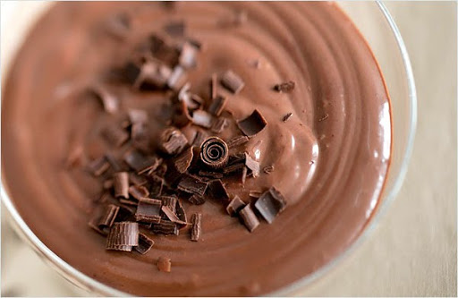 Put all ingredients except for chocolate shavings in a blender and purée until completely smooth, stopping machine to scrape down its sides if necessary. Divide among 4 to 6 ramekins and chill for at least 30 minutes. If you like, garnish with chocolate shavings before serving.