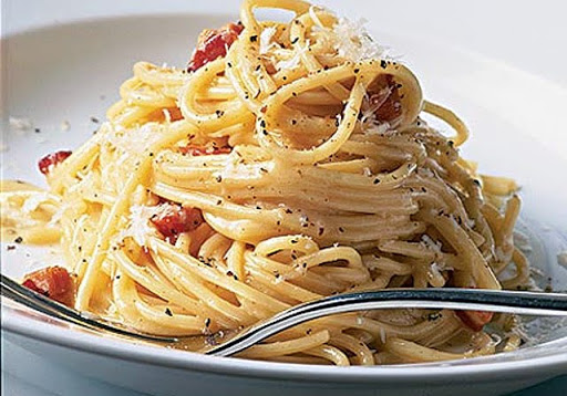 4. Drain pasta well and add it directly to the skillet with pancetta and oil. Pour the egg mixture over the pasta. Toss rapidly to coat the pasta without cooking the egg. Remove pan from heat and add a big handful of cheese, lots of pepper, and a little salt. Continue to toss and turn the pasta until it soaks up egg mixture and thickens, 1 to 2 minutes. Garnish with parsley and extra grated Romano