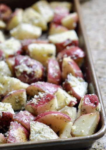 Place in a single layer on a greased cookie sheet and bake at 425 degrees for 35-40 minutes, flipping once and recoating with cheese during cooking. Cook until tops of potatoes start to brown (increase oven temperature to 450 degrees for 5 minutes if not browned at the end of the cook time).