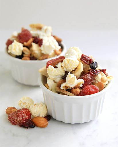 The fun thing about trail mix is that you can put just about anything in it. In my opinion, the best mixes are those that mix different flavors and textures, such as salty, sweet, and crunchy. Popcorn is one of my all time favorite ingredients because it’s so versatile! You start with about six cups of popped popcorn, any flavor, and then build your trail mix from there. If you don’t eat it right away, you can store it in an airtight container for up to a week. Here are some ideas: