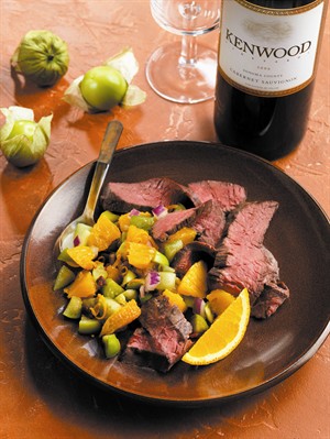 Remove steaks from marinade; discard marinade. Place steaks on grid over medium, ash-covered coals. Grill, uncovered, 10 to 13 minutes (over medium heat on preheated gas grill, covered, 8 to 12 minutes) for medium rare (145°F) to medium (160°F) doneness, turning occasionally. Carve steaks diagonally across the grain into thin slices; season with salt, as desired. Serve with tomatillo salsa. Garnish with reserved orange wedges.