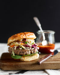 Meanwhile, in a medium bowl, toss the coleslaw mix with the rice vinegar, soy sauce and the remaining 1/2 teaspoon of sesame oil. Season with salt and pepper. Set the burgers on the buns, top with the slaw and serve.