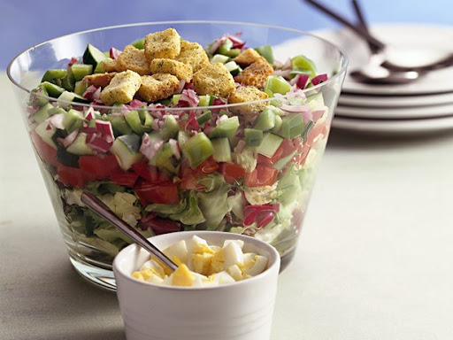 In large glass bowl, layer lettuce, tomatoes, cucumbers, bell pepper and onion. Pour vinaigrette over top. Cover and refrigerate 1 to 2 hours to blend flavors. Sprinkle eggs and croutons over salad. Toss before serving.