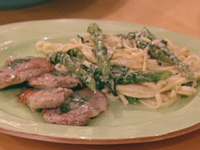 When the pasta's ready, drain it and the asparagus and combine them with the reduced cream and the lemon juice, basil, and grated Parmigiano Reggiano, giving it a nice turn to coat it.