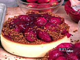 5. Sprinkle the macaroon crunch ina 1 1/2-inch border around the edge of the cheesecake, covering the berries around the outside edge. Loosely cover the entire cake with plastic wrap, being careful not to let the glaze stick to the wrap.