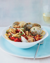 Meanwhile, in a large pot of boiling salted water, cook the bucatini until al dente. Drain the pasta and reserve 1/2 cup of the water. Return the pasta to the pot. Pour the clams, vegetables and sauce over the pasta and cook, stirring, for 1 minute; add some of the reserved pasta water if it seems dry. Add the chopped herbs and walnuts, season lightly with salt and toss gently. Transfer the pasta to wide bowls, drizzle with olive oil andserve.