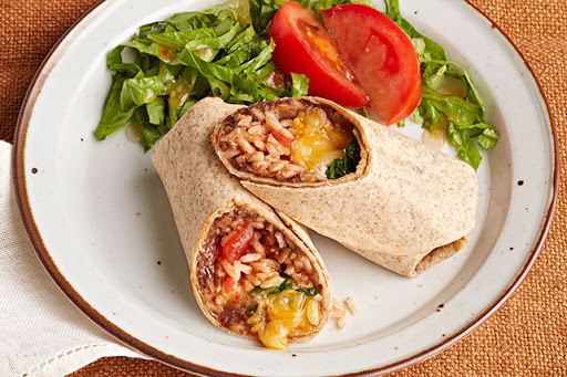 Spread 1 tortilla with 3 Tbsp. beans. Spoon 1/4 cup rice mixture onto tortilla; top with 1/4 cup each of the spinach and cheese. Fold in opposite sides of tortilla, then roll up, burrito style. Repeat with remaining ingredients.