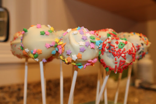 Add the sprinkles while the chocolate is still wet. It will harden quickly. Stick the decorated cake pop into a styrofoam block to finish setting. Place into the freezer to speed up setting time.