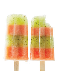 Carefully add 1 1/2 tablespoons of the watermelon layer to the mojito layer in the molds. Freeze until almost firm, 1 hour. Pour the remaining mojito mixture on top and freeze until almost firm, 1 hour. Top with the remaining watermelon layer and freeze until firm, 2 hours. Unmold and serve.