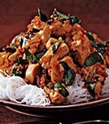 4.Add the remaining 1 tablespoon oil to the skillet and heat for about 1 minute. Working in 2 batches if necessary, spread the chicken in a single layer in the pan without crowding and cook, undisturbed, until the edges change color, about 1 minute. Turn and continue cooking, tossing now and then, until lightly browned all over, 2 to 3 minutes. Add the reserved sauce and onion mixture and cook, tossing occasionally, until the chicken is cooked through and evenly coated, 2 to 3 minutes longer. Remove the pan from the heat and add the basil, tossing until slightly wilted. Serve the chicken over the noodles