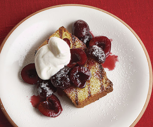 Grilling this pound cake may sound odd, but it’s definitely worth it—the cake gets a toasty texture that contrasts nicely with the soft whipped cream and bold cherry sauce. (You can also use a grill pan, broiler, or toaster oven.)