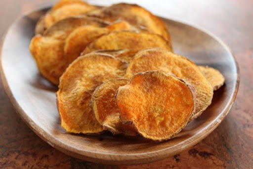 using a mandolin or very sharp knife, carefully slice sweet potato into 1/8 inch slices. lightly coat with oil and sprinkle with salt.