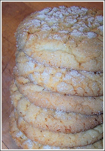 Preheat oven to 350 degrees F. In a mixer fitted with paddle attachment, cream together sugar, butter, and Crisco until light and fluffy, about two minutes. Beat in eggs, one at a time, add vanilla, lemon, and orange extracts. In a separate bowl, stir together flour, baking soda, and cream of tartar. With mixer set to low, gradually add dry mixture to wet ingredients. For each cookie drop two tablespoons of dough (I use a cookie scoop for this) into a bowl of sugar; roll to coat. Place cookies on a greased cookie sheet. Before baking sprinkle about a teaspoon of additional sugar on the top of each dough ball, this will cause the crackled top. Bake for 14-17 minutes or until the edges are light brown. Remove from cookie sheet to cool on wire racks. Makes approximately 30 4" cookies.