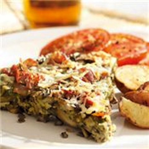 Pour the reserved egg mixture evenly over the rice and vegetables. Partially cover and cook until set around the edges, about 5 minutes. Sprinkle with Parmesan and prosciutto. Place the pan under broiler and broil until the eggs are set and the top is nicely browned, about 2 minutes. Let stand for 5 minutes before serving.