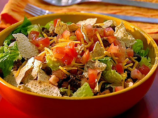 Cut veges to make salad. Brown ground beef with Lipton onion soup. Add to salad mixture, along with corn chips, olives, cheese. Toss