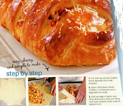 4.On a lightly floured surface, roll pastry into a 12-x-10-inch rectangle. Trim pastry, referring to photo. Spoon half of egg mixture down center of pastry. Referring to photos, cut strips and braid pastry. Transfer to prepared baking sheet. Repeat procedure with remaining puff pastry and egg mixture.