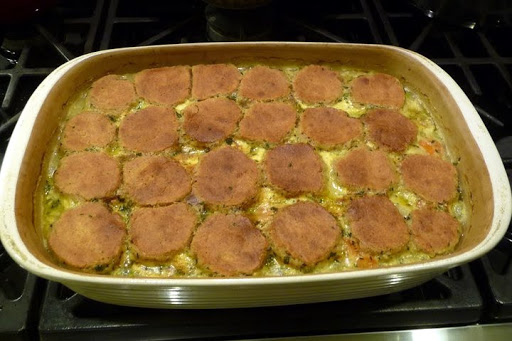Bake for 15-18 minutes until dumplings are lightly browned and casserole is bubbly. Allow to cool five minutes before serving. Serves 6-8. Enjoy!