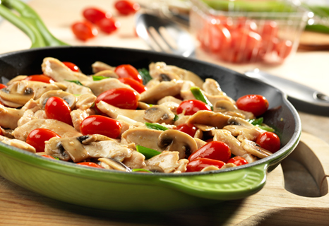 Here's a way to get great flavor, fast. This quick-cooking skillet dish features strips of sautéed chicken with mushrooms, green onions and grape tomatoes.