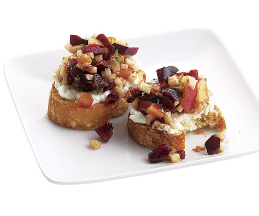 In a small bowl, mix the goat and ricotta cheeses with a pinch each of salt and black pepper. Lightly spread the cheese over each baguette toast and top with the cherry relish.