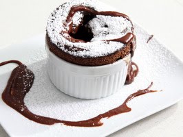 To serve: Place a ramekin on each of 4 plates and sift confectioners' sugar over the top of each souffle. Break the tops of the souffles and spoon in the warm chocolate sauce, allowing it to drip over the sides.